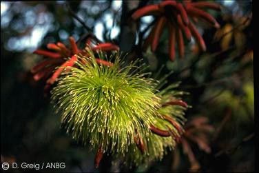 | | Herkunft / Verbreitung: | | Australien (WA) | | Habitus: | | mittelgroßer, ausladender, dicht belaubter Strauch bis ca. 5m mit wechselständig angeordneten, bis zu 7cm langen, elliptischen bis lanzettlichen, hell- bis tiefgrünen Blättern und attraktiven, gelblich-grünen Blüten, die in den Blattachseln bis zu 12cm große, kugelförmige Dolden bilden | | Vermehrung: | | Aussaat | | Aussaat: |  | die feinen Samen werden nur leicht in die Oberfläche einer Mischung aus Aussaaterde und Sand oder Perlite eingearbeitet. Hell und warm (20-25°C) aufgestellt, sowie konstant leicht feucht gehalten, keimen die Samen je nach Art innerhalb eines Zeitraums von etwa 3-6 Wochen. Bei zu dichter Aussaat entwickeln sich in der Regel schwächliche, dünne Sämlinge. Um dies weitestgehend zu verhindern, sollten die feinen Samen vor der Aussaat mit etwas trockenem, gesiebtem Sand vermischt werden und in dieser Form auf das Substrat gestreut werden. | | Aussaatzeit: | | ganzjährig möglich, bevorzugt jedoch im Frühjahr | | Topf- / Kübelkultur: | |