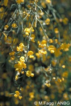 | | Herkunft / Verbreitung: | | Australien (QLD, NSW) | | Habitus: | | mehrjähriger, immergrüner, mittelgroßer bis hoher Strauch bis ca. 5m mit dunkelgrauer Rinde, ausladenden bis aufrechten, häufig auch überhängenden Zweigen und kleinen, auf Knospenschuppen reduzierten, grau-grünen Blättern. Die ca. 1,3cm großen, süßlich duftenden, cremefarbenen bis orange-gelben Blüten mit roter Basis erscheinen in endständigen, überhängenden Blütenständen. | | Vermehrung: | | Aussaat / Stecklinge | | Aussaat: |  | die Samen vor der Aussaat mit heißem Wasser übergießen und ca. 24-48 Stunden vorquellen lassen. Anschließend max. 0,5cm tief in eine Mischung aus Aussaaterde und Sand oder Perlite auslegen, hell und warm (23°C+) aufstellen, sowie konstant feucht (nicht naß!) halten. | | Aussaatzeit: | | ganzjährig möglich, bevorzugt im Frühjahr/Sommer! | | Topf- / Kübelkultur: | |