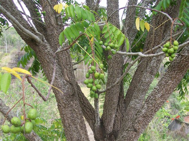 | | Herkunft / Verbreitung: | | Südostasien, Trop. Amerika weite Verbreitung in den Tropen | | Habitus: | | mehrjähriger, laubabwerfender Baum bis ca. 25m mit wechselständig angeordneten, bis zu 40cm langen, unpaarig gefiederten Blättern, die sich aus gegenständig angeordneten, bis zu 10cm langen, elliptischen, oberseits glänzend dunkelgrünen Blättchen und einem endständigen Blatt zusammensetzen. Die kleinen, duftenden, gelblich-weißen Blüten erscheinen in bis zu 30cm langen Rispen an den Zweigenden am fast laublosen Holz. Aus den Blüten entwickeln sich eiförmige, bis 4cm lange, bei Reife gelbe bis orangerote Früchte. | | Vermehrung: | | Aussaat / Stecklinge | | Aussaat: |  | die Samen vor der Aussaat ca. 24-48 Stunden in lauwarmem Wasser vorquellen lassen. Anschließend ca. 1-2cm tief in eine Mischung aus Aussaaterde und Sand oder Perlite auslegen, hell und warm (25°C+) aufstellen, sowie konstant feucht (nicht naß!) aufstellen. | | Aussaatzeit: | | ganzjährig | | Topf- / Kübelkultur: | | Spondias mombin bevorzugt ganzjährig einen warmen, halbschattigen bis sonnigen Standort, die Überwinterung kann, da laubabwerfend, dunkler, bei ca. 15°C+ erfolgen. Während der heißen Jahreszeit sollte in regelmäßigen Abständen gegossen werden, während der Wintermonate ist nur soviel zu gießen, daß eine leichte Ballenfeuchtigkeit erhalten bleibt. Als Substrat eignet sich eine gute, nährstoffreiche Einheitserde mit einem Anteil Sand oder Perlite, um eine gute Durchlässigkeit zu gewährleisten. Als Dünger kann ein Langzeitdünger eingesetzt werden.