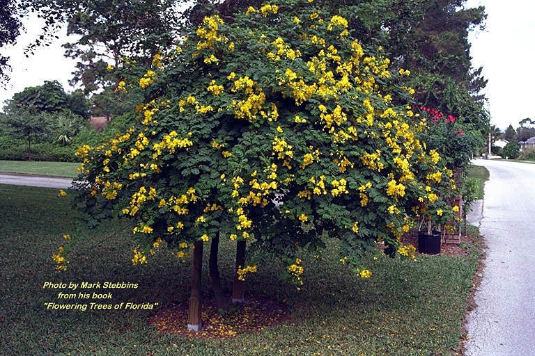 | | Herkunft / Verbreitung: | | tropisches Amerika weite Verbreitung in den Tropen und Subtropen | | Habitus: | | mehrjähriger, immergrüner, dichtbelaubter Strauch oder kleiner Baum bis ca. 4m mit wechselständig angeordneten, paarig gefiederten Blättern, die sich aus bis zu 8 Paar, gegenständig angeordneten, länglich ovalen, dunkelgrünen Blättchen zusammensetzen. Die sehr attraktiven, goldgelben Schalenblüten mit herausragenden Staubgefäßen erscheinen in endständigen, lockeren Büscheln.