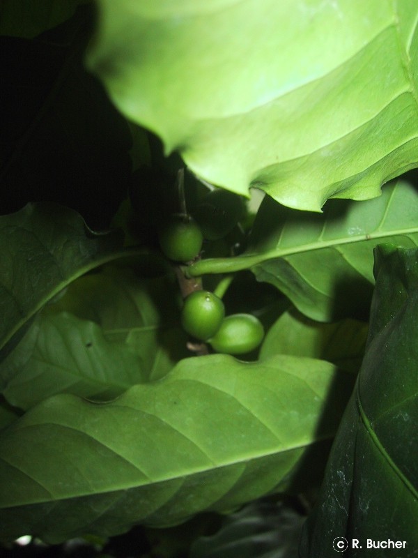 | | Herkunft / Verbreitung: | | Abessinien weltweite Verbreitung, auch als Topf- bzw. Kübelpflanze | | Habitus: | | mehrjähriger, immergrüner, hoher Strauch oder kleiner Baum bis ca. 6m mit waagrechten, leicht überhängenden Zweigen und gegenständig angeordneten, kurzgestielten, ledrigen, elliptischen, oberseits glänzend dunkelgrünen Blättern. Die sternförmigen, reinweißen, intensiv duftenden Blüten erscheinen in Gruppen mit bis zu 15 Einzelblüten in den Blattachseln. Aus den Blüten entwickeln sich bei Reife dunkelrote Früchte (Kaffeekirschen), die 1-2 Samen beinhalten. | | Vermehrung: | | Aussaat / Stecklinge | | Aussaat: |  | die Samen vor der Aussaat ca. 24-48 Stunden in warmem Wasser vorquellen lassen. Anschließend die Samenschale sowie das eng an den Samen anhaftende Silberhäutchen vorsichtig entfernen. Die Samen dann mit der flachen Seite nach unten max. 1cm tief in ein Gemisch aus Aussaaterde und Sand oder Perlite auslegen, hell und warm (23-25°C) aufstellen, sowie konstant feucht halten. | | Aussaatzeit: | | ganzjährig, da nur frisches Saatgut zuverlässig keimt! | | Topf- / Kübelkultur: | | Coffea arabica ist für die Topf- bzw. Kübelkultur sehr gut geeignet, er ist ebenfalls eine ideale Zimmerpflanze für ein helles Ost- oder Westfenster. Der Standort während der Sommermonate sollte hell, jedoch nicht vollsonnig sein. Als Unterholzpflanze bevorzugt er einen eher halbschattigen Platz, auch im Freien. Die Überwinterung sollte ebenfalls hell erfolgen, bei einer Temperatur von ca. 15°C. Das Gießen sollte regelmäßig erfolgen, während der kalten Jahreszeit, gerade bei kühlerer Überwinterung, sollte das Substrat trockener gehalten werden. Günstig für ein gutes Gedeihen wirkt sich ein häufiges Übersprühen mit temperiertem, möglichst kalkfreiem Wasser aus. Das Substrat sollte leicht sauer sein, eine Mischung aus einer humosen und durchlässigen Einheitserde und 1/4 Torf hat sich als sehr günstig erwiesen. Als Dünger kann ein Langzeitdünger eingesetzt werden.