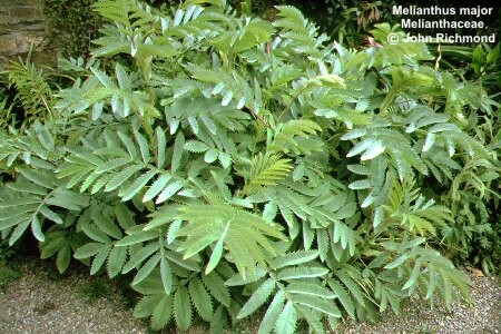 | | Herkunft / Verbreitung: | | Südafrika | | Habitus: | | mehrjähriger, immergrüner, aufrechter Halbstrauch bis ca. 3m mit wechselständig angeordneten, auffälligen, geteilten, bis zu 75cm langen, blau-grünen Blättern. Die einzelnen Fiederblätter besitzen tief gesägte Blattränder und hängen leicht über. Die ausgesprochen attraktiven, röhrenförmigen, rostroten Blüten erscheinen in langgestielten, aufrechten Blütenständen über den Blättern. | | Vermehrung: | | Aussaat / Stecklinge | | Aussaat: |  | die kleinen, schwarzen Samen vor der Aussaat ca. 24 Stunden in warmem Wasser vorquellen lassen. Anschließend ca. 1/2cm tief in eine Mischung aus Aussaaterde und Sand oder Perlite auslegen, hell und warm (23-25°C) aufstellen, sowie konstant feucht halten (nicht naß !) | | Aussaatzeit: | | Herbst | | Topf- / Kübelkultur: | | Melianthus major bevorzugt während der Sommermonate einen sonnigen, warmen Standort, die Überwinterung sollte ebenfalls hell, bei ca. 5-10°C erfolgen. Während der warmen Jahreszeit ist der Wasserbedarf hoch, regelmäßige Wassergaben sind für eine gute Entwicklung erforderlich. Während der Wintermonate sollte nur soviel gegossen werden, daß das Substrat nicht völlig austrocknet. Als Substrat eignet sich eine gute, nährstoffreiche Einheitserde mit einem hohen Anteil Sand oder Perlite/Vermiculite, um eine gute Durchlässigkeit zu gewährleisten. Für eine gute Drainage sollte ebenfalls gesorgt werden, Staunässe wird nicht vertragen. Als Dünger kann ein Langzeitdünger eingesetzt werden. Melianthus major ist recht kältetolerant, daher kann in milden Gegenden (Weinbauklima) ein Auspflanzversuch gewagt werden. An einem sonnigen, warmen, geschützten Standort und mit einer dicken Mulchschicht treibt Melianthus in der Regel wieder aus.